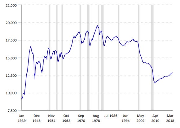 See the diagram that plots BLS data of the number of manufacturing jobs.