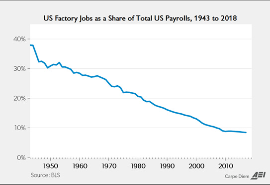 Over the last 40 years, the number of manufacturing jobs peaked in 1979 and then rapidly declined since 2002 as globalization was launched and the economy continued to shift to service-providing industries.